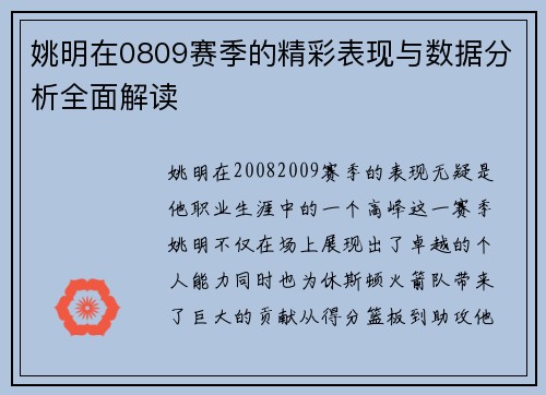 姚明在0809赛季的精彩表现与数据分析全面解读